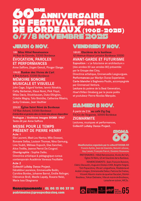 The SIGMA 60 collective, composed of Francis Ayliès, Jean de Giacinto, Benoît Lafosse, Guy Lenoir, François Parrot, and Dominic Rousseau, has decided to celebrate the festival’s sixtieth anniversary on November 6, 7, and 8, 2025.